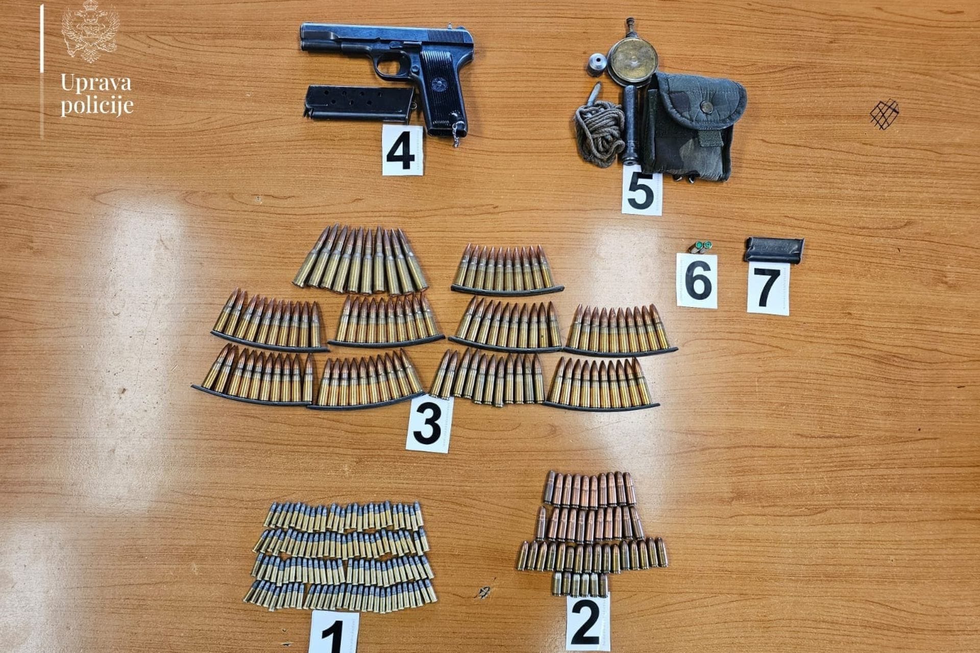 "Prilikom pretresa pronađeni su i oduzeti predmeti u ilegalnom posjedu: pištolj marke „Crvena Zastava M57“, kalibra 7,62 mm; 243 komada municije nepoznate marke i kalibra; okvir od malokalibarskog oružja. R.P. je doveden u službene prostorije radi kriminalističke obrade i prikupljanja obavještenja, a od njega su oduzeti pronađeni predmeti, kao i službeno naoružanje i druga sredstva prinude koja ima na ličnom zaduženju", stoji u saopštenju policije.