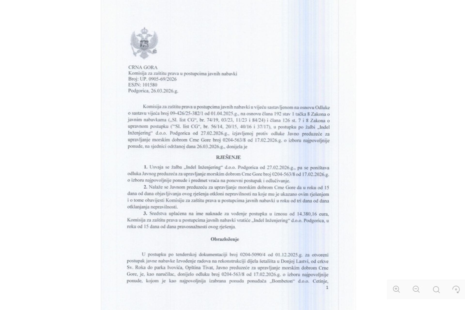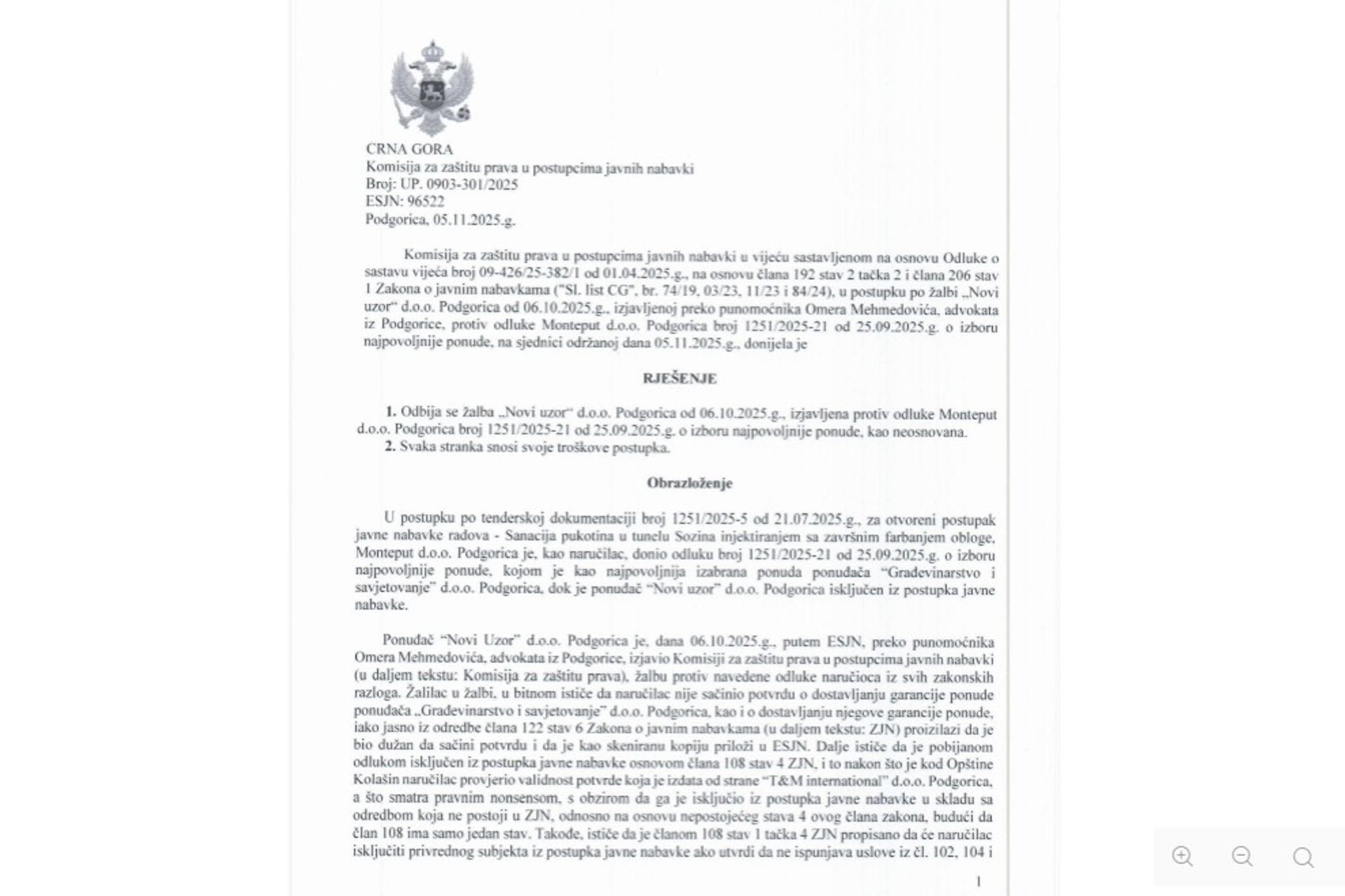 „Ako Komisija priznaje da izabrani ponuđač može dobiti ugovor vrijedan skoro tri miliona eura, a da se njegova ispravnost uopšte ne ispituje – da li to znači da zakonitost izabrane ponude više nije predmet kontrole? Ako jeste, kada i u kojem postupku se ta kontrola sprovodi”, pitali su iz Novog Uzora.