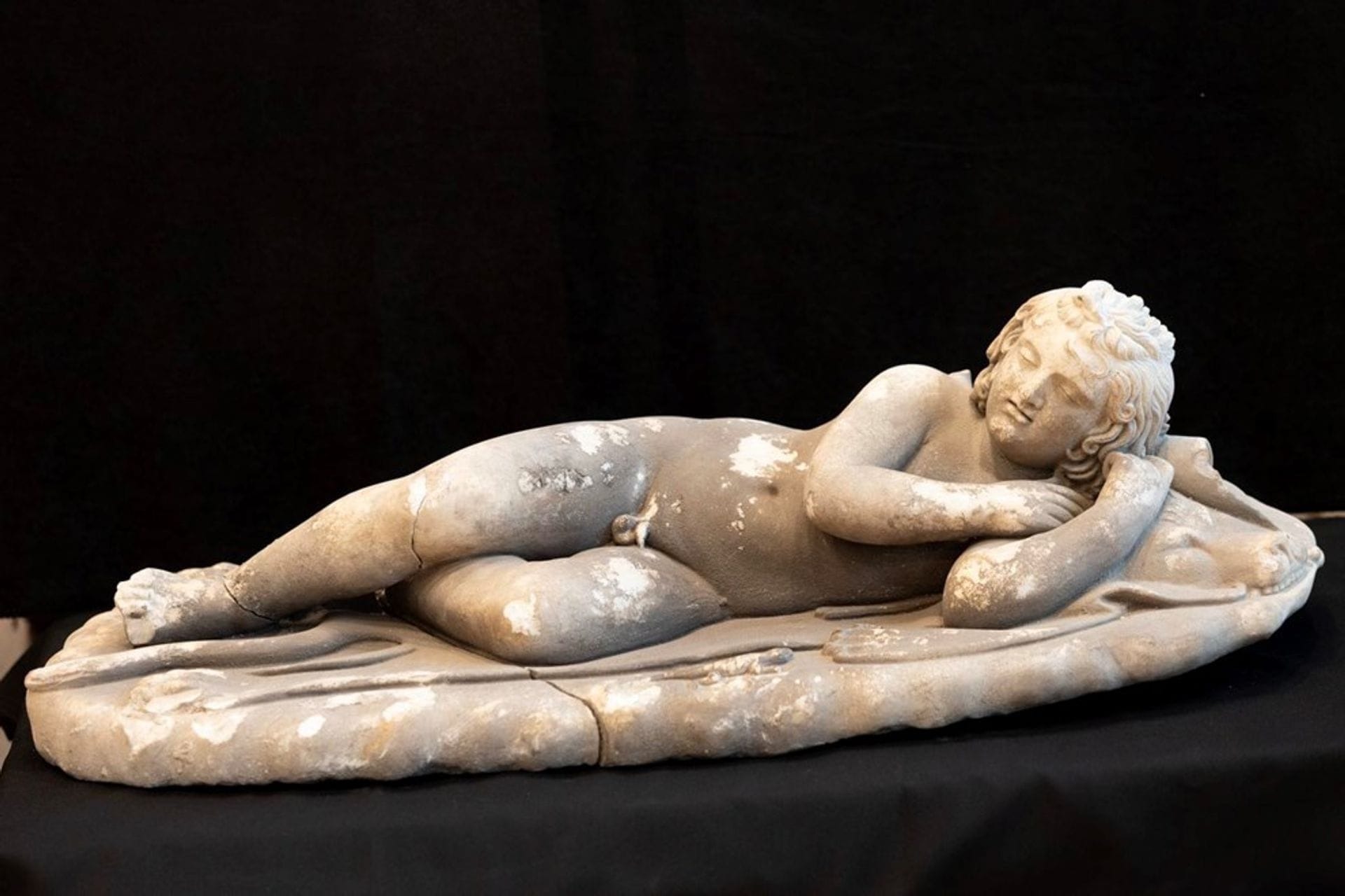 Djelo dugačko 98, široko 44 a visoko 30 centimetara pronađeno je u dva dijela, no uprkos tome arheolozi ga opisuju kao "savršenstvo antičkog kiparstva", a skulptura prikazuje Kupida koji leži na lavljoj koži, a pokraj njega je mali gušter.