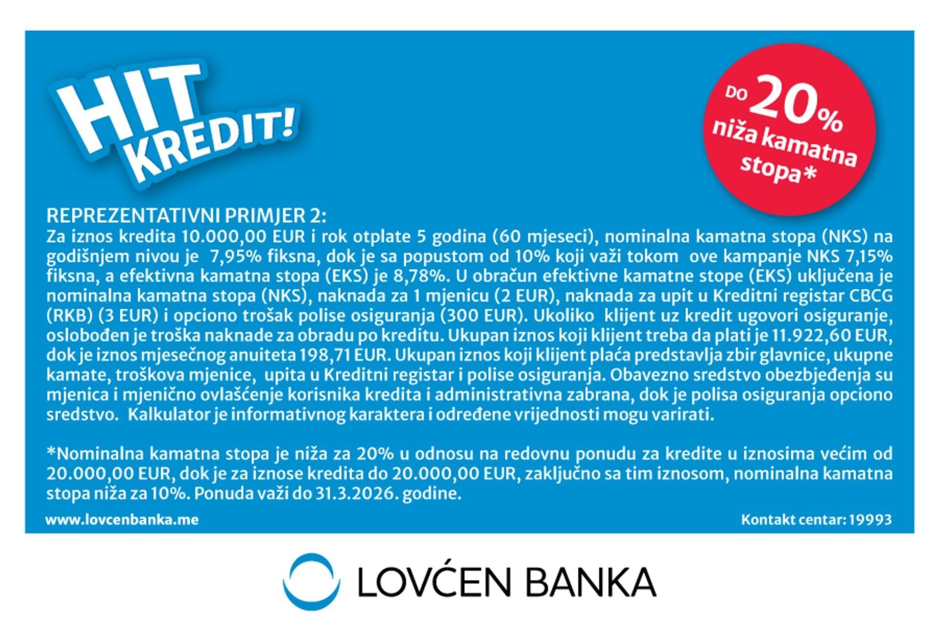 Za iznos kredita 10.000,00 EUR i rok otplate 5 godina (60 mjeseci), nominalna kamatna stopa (NKS) na godišnjem nivou je 7,95% fiksna, dok je sa popustom od 10% koji važi tokom ove kampanje NKS 7,15% fiksna, a efektivna kamatna stopa (EKS) je 8,78%. U obračun efektivne kamatne stope (EKS) uključena je nominalna kamatna stopa (NKS), naknada za 1 mjenicu (2 EUR), naknada za upit u Kreditni registar CBCG (RKB) (3 EUR) i opciono trošak polise osiguranja (300 EUR). Ukoliko klijent uz kredit ugovori osiguranje, oslobođen je troška naknade za obradu po kreditu. Ukupan iznos koji klijent treba da plati je 11.922,60 EUR, dok je iznos mjesečnog anuiteta 198,71 EUR. Ukupan iznos koji klijent plaća predstavlja zbir glavnice, ukupne kamate, troškova mjenice, upita u Kreditni registar i polise osiguranja. Obavezno sredstvo obezbjeđenja su mjenica i mjenično ovlašćenje korisnika kredita i administrativna zabrana, dok je polisa osiguranja opciono sredstvo. Kalkulator je informativnog karaktera i određene vrijednosti mogu varirati.