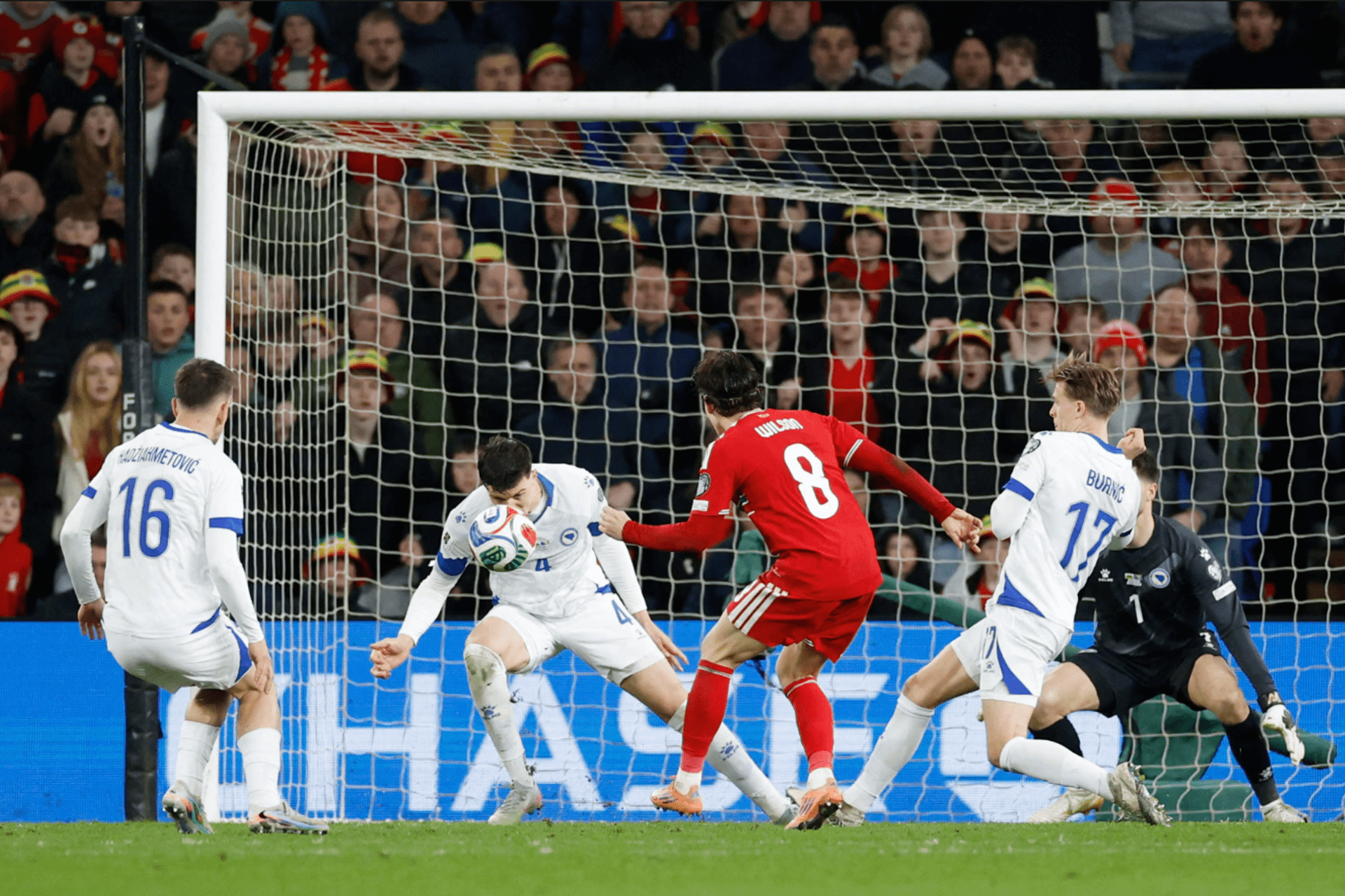 Imali su igrači BiH mnogo sreće u 60. minutu – nakon kontre, Džejms je odlično pokušao, ali je pogodio prečku. Tri minuta kasnije, Demirović je poslao loptu glavom, gotovo da su je svi u Kardifu vidjeli u mreži, ali je Darlou čudesnom intervencijom spasio Velšane.