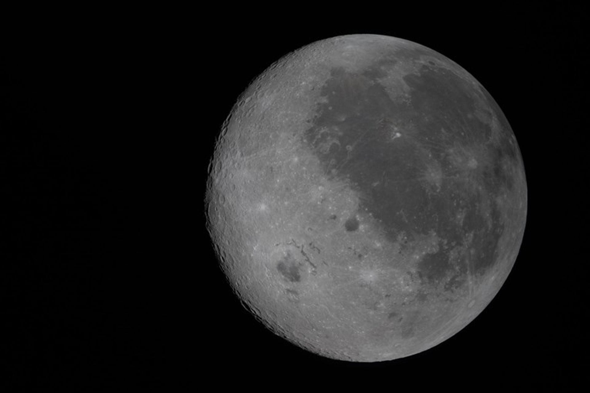 Na desnoj strani vidi se njegova bliža strana - ona koja je okrenuta prema Zemlji - prepoznatljiva po tamnim područjima na površini, koja su zapravo drevni tokovi lave iz vremena kada je Mjesec bio vulkanski aktivan.