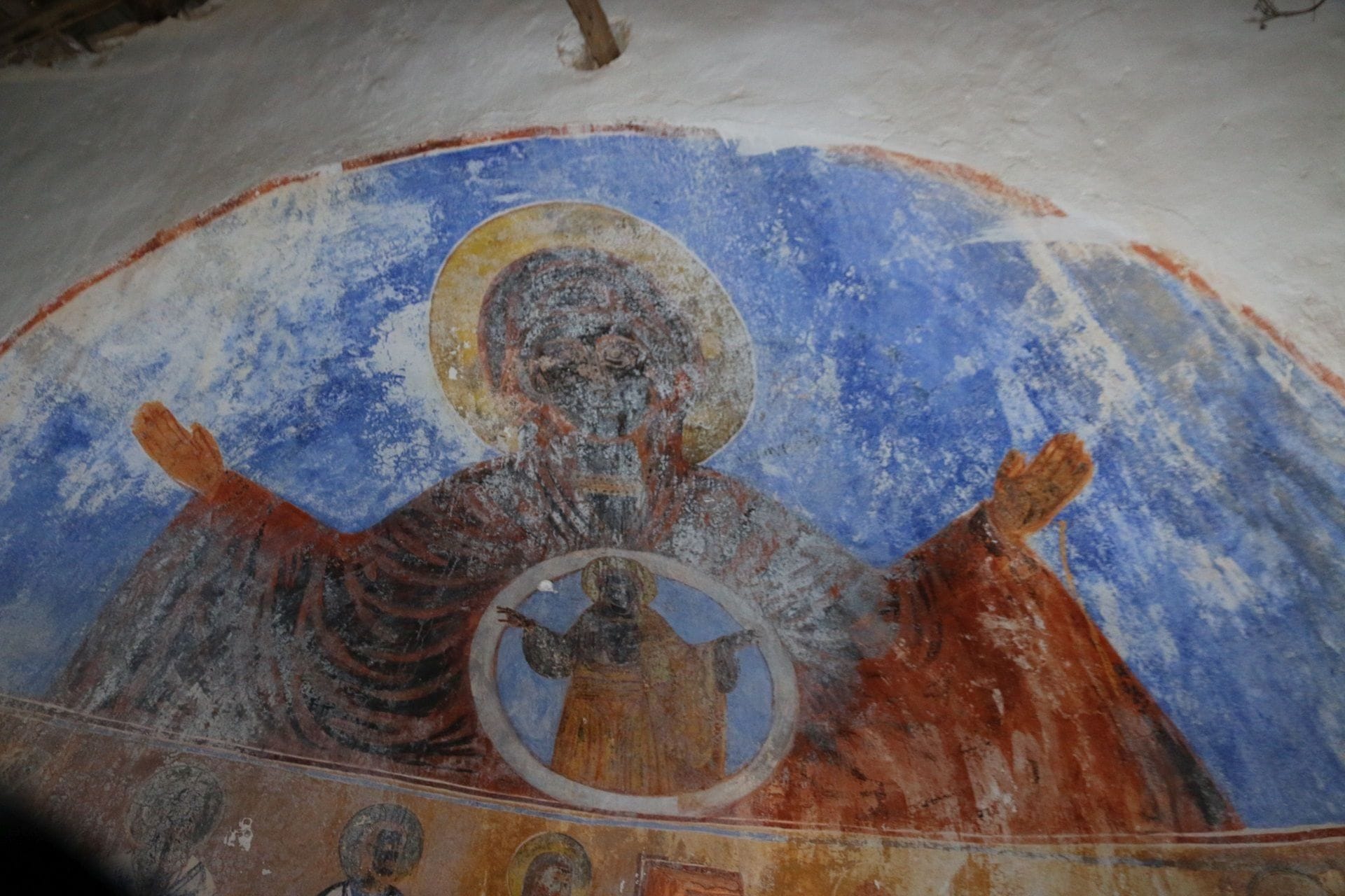 Druga crkva pokazuje oštećenu fresku Svete Bogorodice, koja se jedva razaznaje.