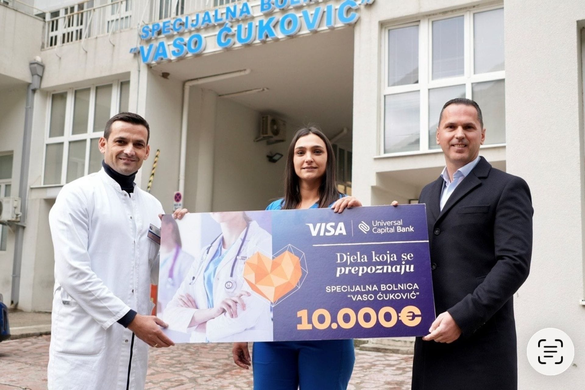 U okviru zajedničkog projekta „Djela koja se prepoznaju“, Universal Capital Banka u saradnji sa kompanijom Visa, uručila je vrijednu donaciju u iznosu od 10.000,00 eura Specijalnoj bolnici za ortopediju, neurohirurgiju i neurologiju 'Vaso Ćuković'. Sredstva su opredijeljena za nabavku dopler aparata za krvne sudove, koji će značajno unaprijediti dijagnostičke kapacitete ove ustanove i omogućiti bržu i precizniju zdravstvenu zaštitu građanima Risna i okoline. Takodje dio sredstava namijenjen je i za nabavku dodatne računarske opreme koja ce omoguciti lakše i brze funkcionisanje bolničkog informacionog sistema.