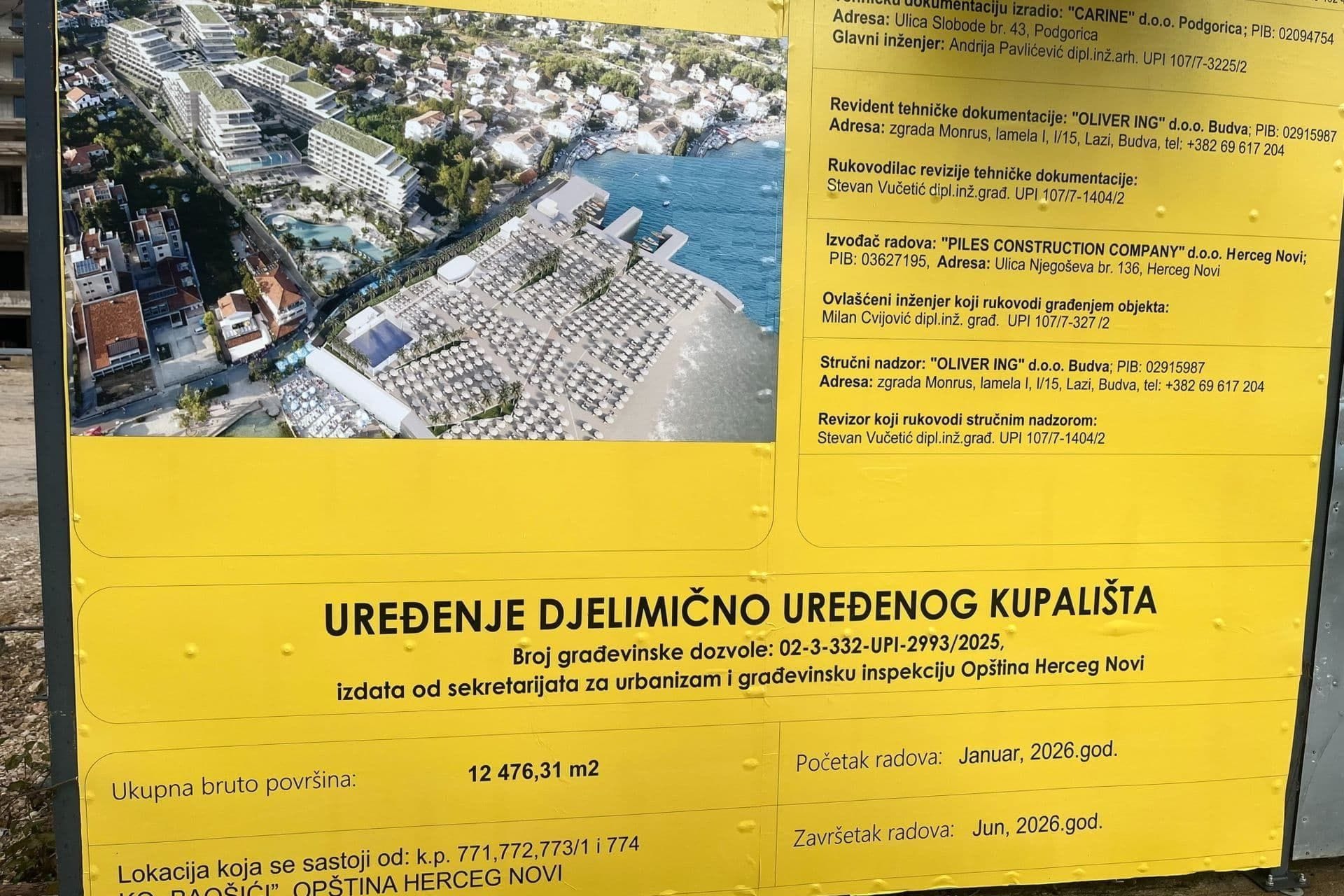 „Ovim radnjama je direktno zauzet prostor akvatorijuma Bokokotorskog zaliva, uz vidljivo i trajno narušavanje postojeće linije obale i prirodnog ambijenta ovog izuzetno osjetljivog područja. Prema 3D prikazu planiranog, djelimično uređenog kupališta, istaknutom na građevinskoj tabli, može se pretpostaviti da je predviđeno nasipanje obale u more u dužini od približno 90 metara. Na terenu je, takođe, zatečena znatno veća količina građevinskog materijala, prvenstveno tipskih konstruktivnih elemenata od armiranog betona, što ukazuje na ozbiljne pripremne aktivnosti za nastavak i proširenje radova znatno većeg obima“, navodi se u izvještaju Uprave.